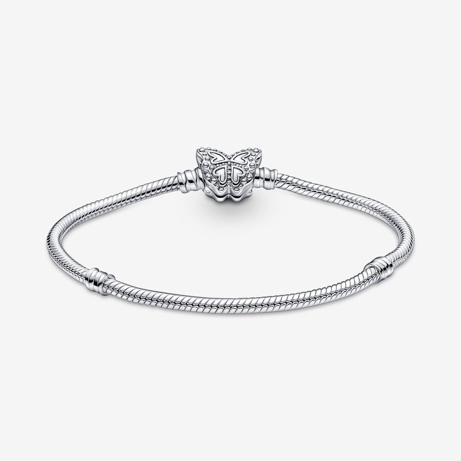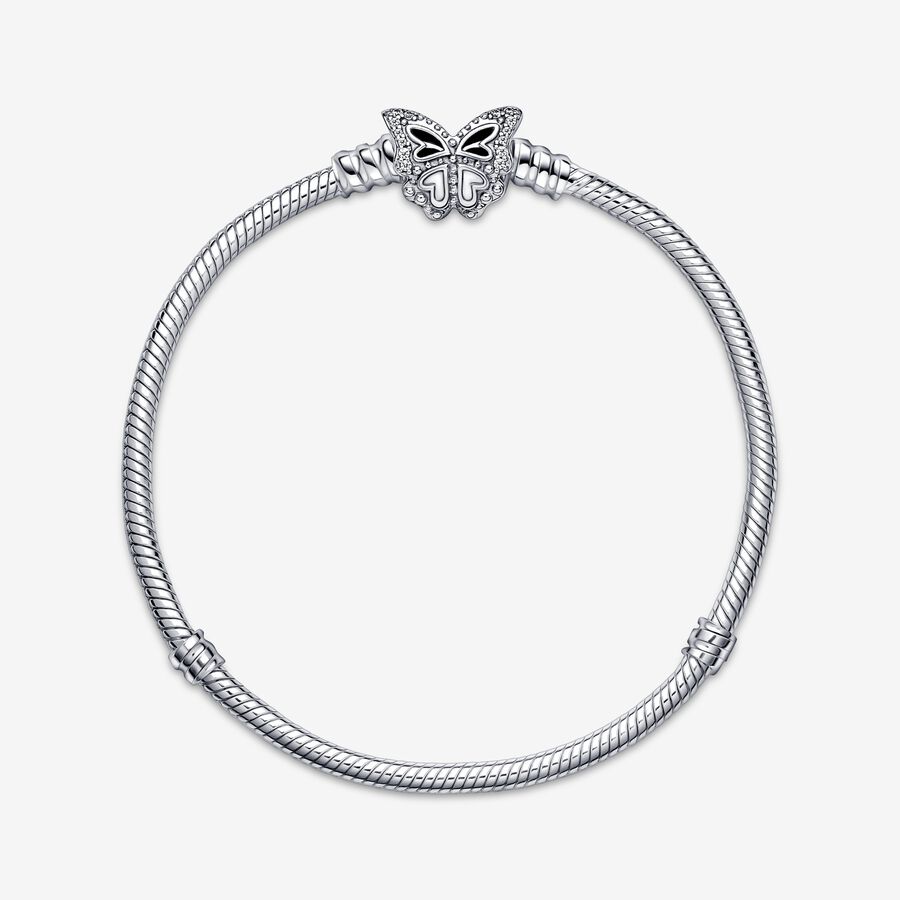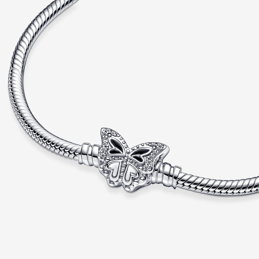 Tell your spring story and be inspired by the season of transformation with our sterling silver Pandora Moments Butterfly Clasp Snake Chain Bracelet. Cut-out and raised heart details and sparkling bead-set round brilliant-cut clear cubic zirconia give depth and dimension to the butterfly’s wings. Style up to 18 charms on the bracelet and carry spring moments with you wherever you go. Pair it with other sterling silver pieces, like our Blue Butterfly Hoop earrings.
