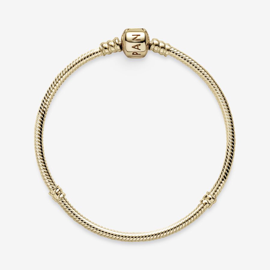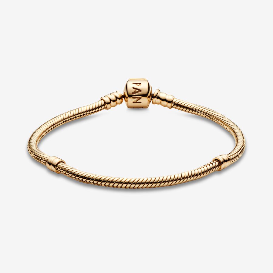 This charm bracelet is the perfect foundation for your Pandora collection. Hand-finished in 14k gold, this snake chain bracelet features Pandora’s iconic barrel clasp for a secure fit while the innovative threading system makes it easy to screw charms onto your bracelet. Simply add a couple of clips to divide the bracelet into three sections, then choose your favourite Pandora charms to express your unique style.