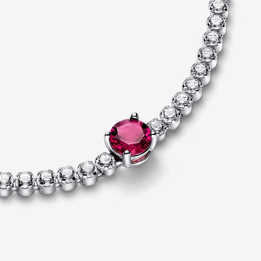 Bring elegance to your outfit with the Red Sparkling Round Pavé Tennis Bracelet. Crafted from sterling silver, this tennis bracelet features a large central round brilliant-cut man-made crystal in a beautiful rich red, framed by a row of clear cubic zirconia pavé. The bracelet includes a lobster clasp for safe closure and can be adjusted to three lengths. Style this design on its own or with other shimmering Pandora Timeless pieces for a classic look that stands out.