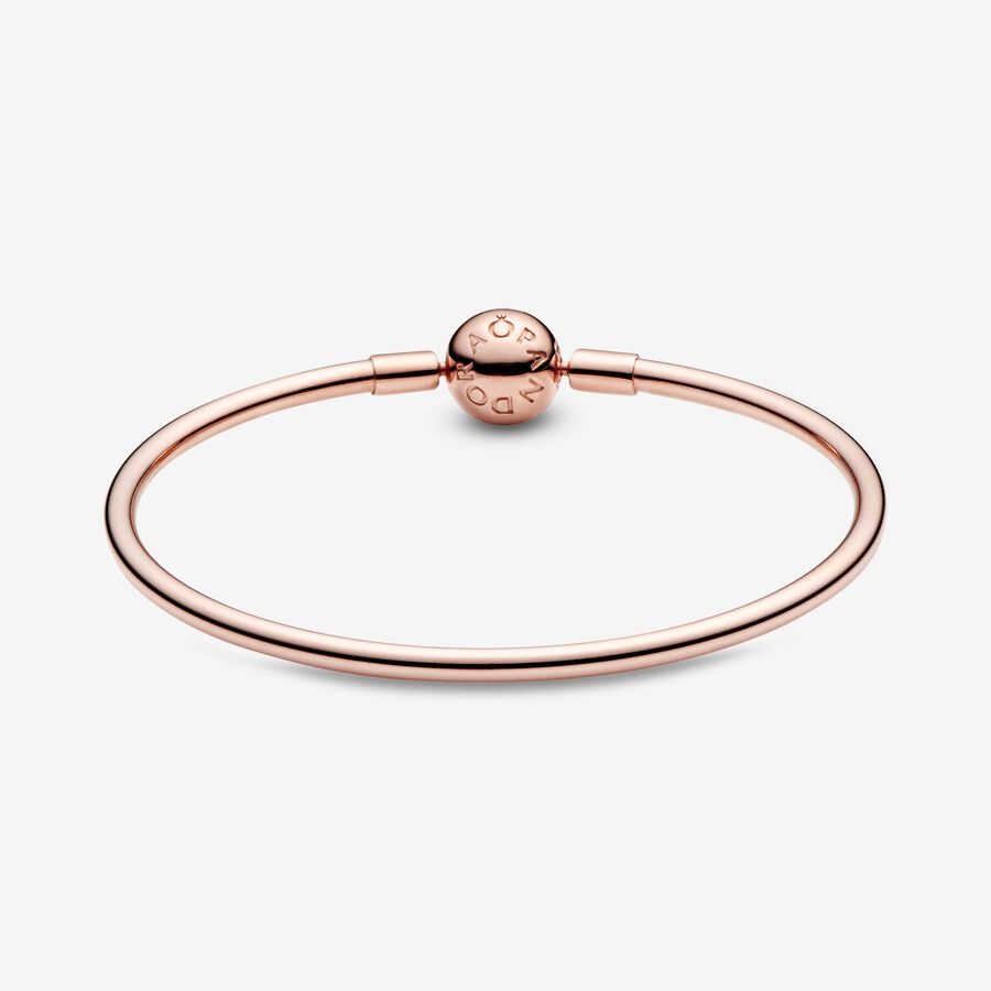 The simple things in life often are the greatest gifts. Like this minimalist Pandora Moments Bangle, carefully plated with 14k rose gold. The sleek style is stamped on the ball clasp with our logo – a subtle way to channel the trend. Adding polished edge to any look, try using silicone-lined clips to space out charms or dare to bare and wear it solo.